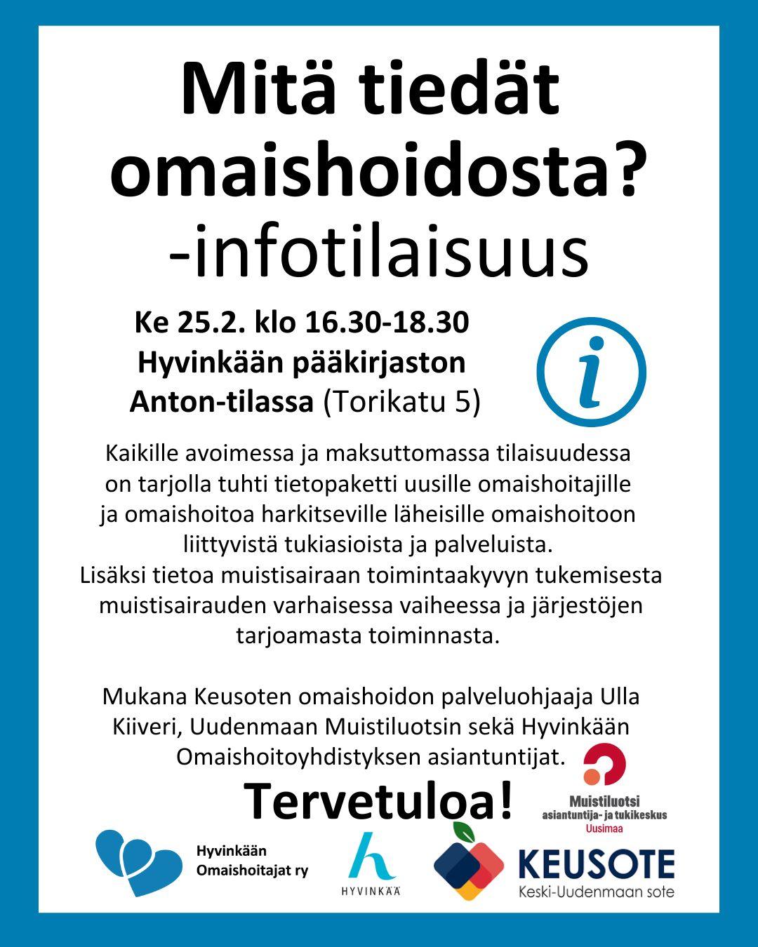 Mitä tiedät omaishoidosta? -infotilaisuus järjestetään keskiviikkona 25.2. klo 16.30–18.30 ryhmätila Antonissa Hyvinkään kirjastossa Kaikille avoimessa ja maksuttomassa tilaisuudessa on tarjolla tuhti…