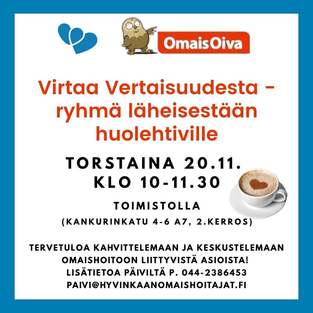 Virtaa Vertaisuudesta -ryhmä on tarkoitettu läheisestään huolehtiville ihmisille. Tällä kertaa saamme vieraaksi Leena Räisäsen, joka toimii sekä Keusoten, että Hyvinkään kaupungin vanhusneuvostossa.…