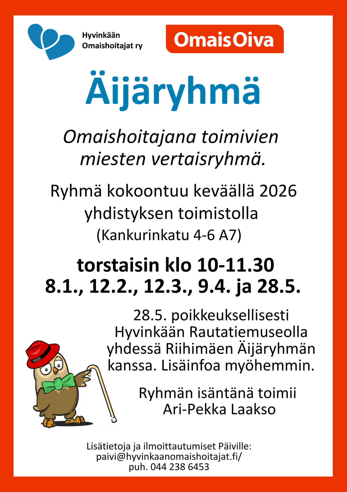 Torstaina saamme Äijäryhmään vieraaksi Omaishoitajaliiton Ukkohoivaa-hankkeen koordinaattorin Sven Claesin. Tervetuloa mukaan! Huom. toukokuun kerta vasta kuun lopussa yhdessä Riihimäen äijäryhmän kanssa.