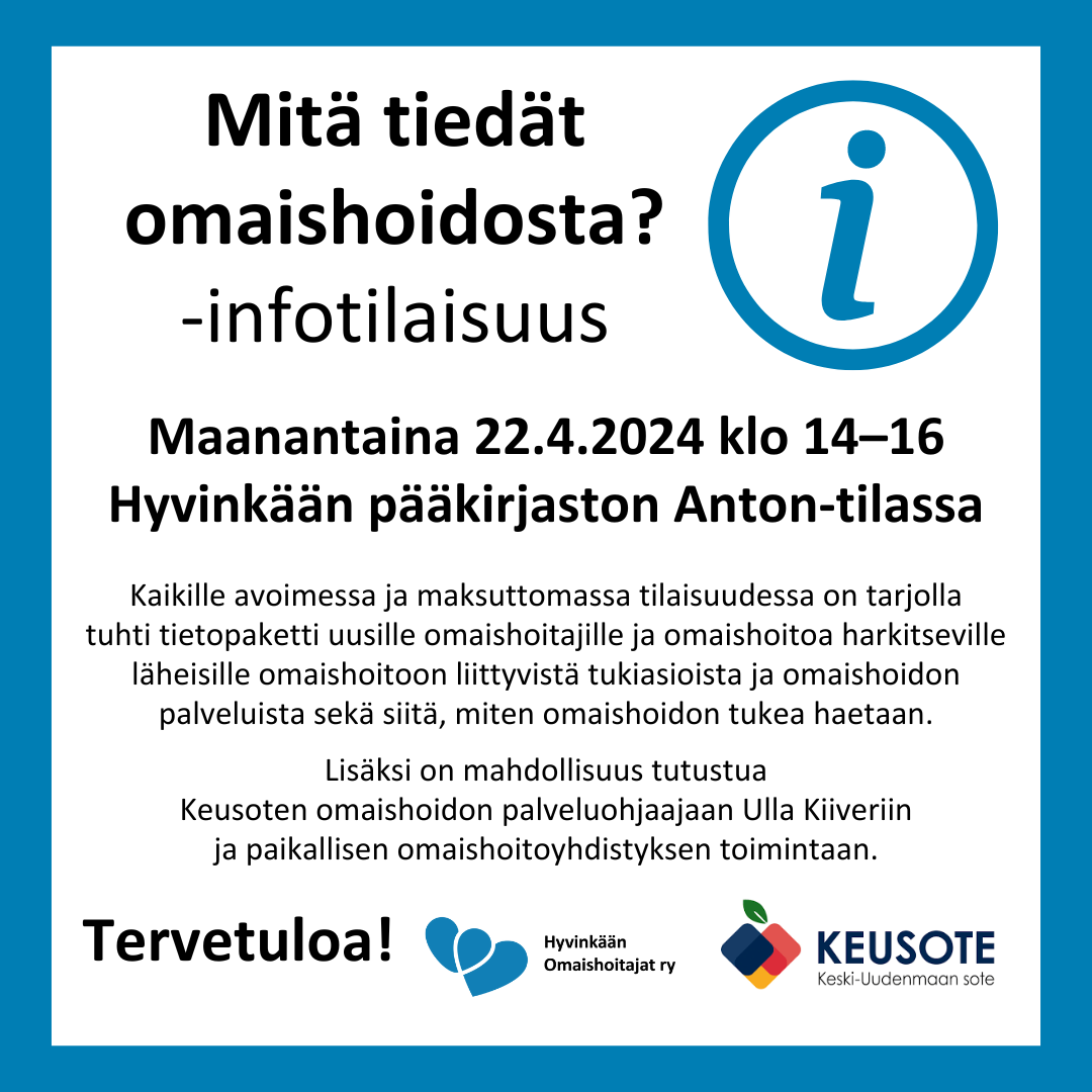 Tervetuloa Mitä tiedät omaishoidosta? -infotilaisuuteen maanantaina 22.4. klo 14–16 Hyvinkään pääkirjaston Anton-tilaan (Torikatu 5)!
