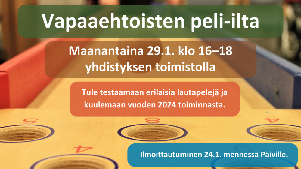 Yhdistyksen vapaaehtoistoimija: Tervetuloa testaamaan erilaisia lautapelejä ja kuulemaan vuoden 2024 toiminnasta.