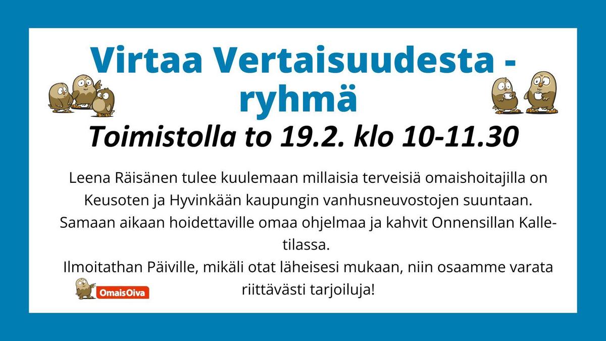Virtaa Vertaisuudesta -ryhmä on tarkoitettu läheisestään huolehtiville ihmisille. Tällä kertaa saamme vieraaksi Leena Räisäsen, joka toimii sekä Keusoten, että Hyvinkään kaupungin vanhusneuvostossa. Leena haluaa kuulla, millaisia terveisiä omaishoitajilla on vanhusneuvostoille. Samaan aikaan hoidettaville on omaa toimintaa viereisessä Kalle-tilassa. Ilmoitathan Päiville (paivi@hyvinkaanomaishoitajat.fi tai p.0442386453) mikäli läheisesi tulee mukaan, niin osaamme varata riittäväsi kahvia!